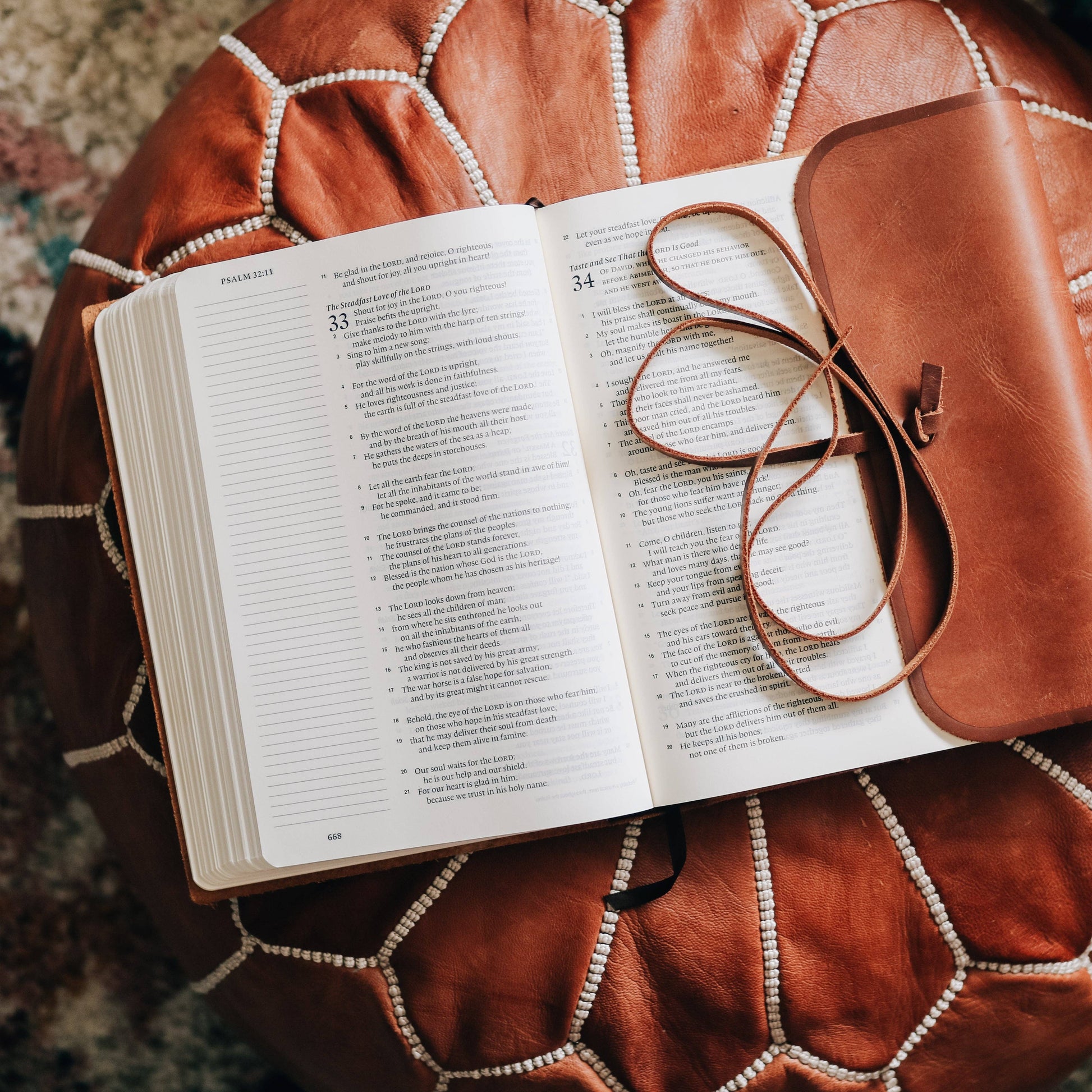 This journaling Bible has a larger print than a standard journaling Bible. However, this is not an extra large print. Please check the excerpts linked below to verify that the print is what you desire. The ESV Single Column Journaling Bible, Large Print features the same high-quality Bible paper and two-inch ruled margins as the original ESV Single Column Journaling Bible, but now with larger, 9.5-point type. This new edition is perfect for those seeking a large-print Bible with plenty of space for notes, prayers, reflections, or artwork. Details: * Brown Natural Leather with Flap and wraparound strap * Size: 6.5" x 9.25" * 9.5-point type * 1,568 pages * Single-column, paragraph format * Cream-colored paper * 2" ruled margins * Smyth-sewn binding * Packaging: Box THIS BIBLE IS NATURAL LEATHER AND PRONE TO WEAR WITH AGE. WE LOVE THE CHARACTER THAT THE BIBLE TAKES ON OVER TIME, IF YOU ARE NOT OPEN TO WEAR AND POTENTIAL SCRATCHES, YOU MAY WANT TO TRY ANOTHER STYLE. BECAUSE THIS IS A LEATHE