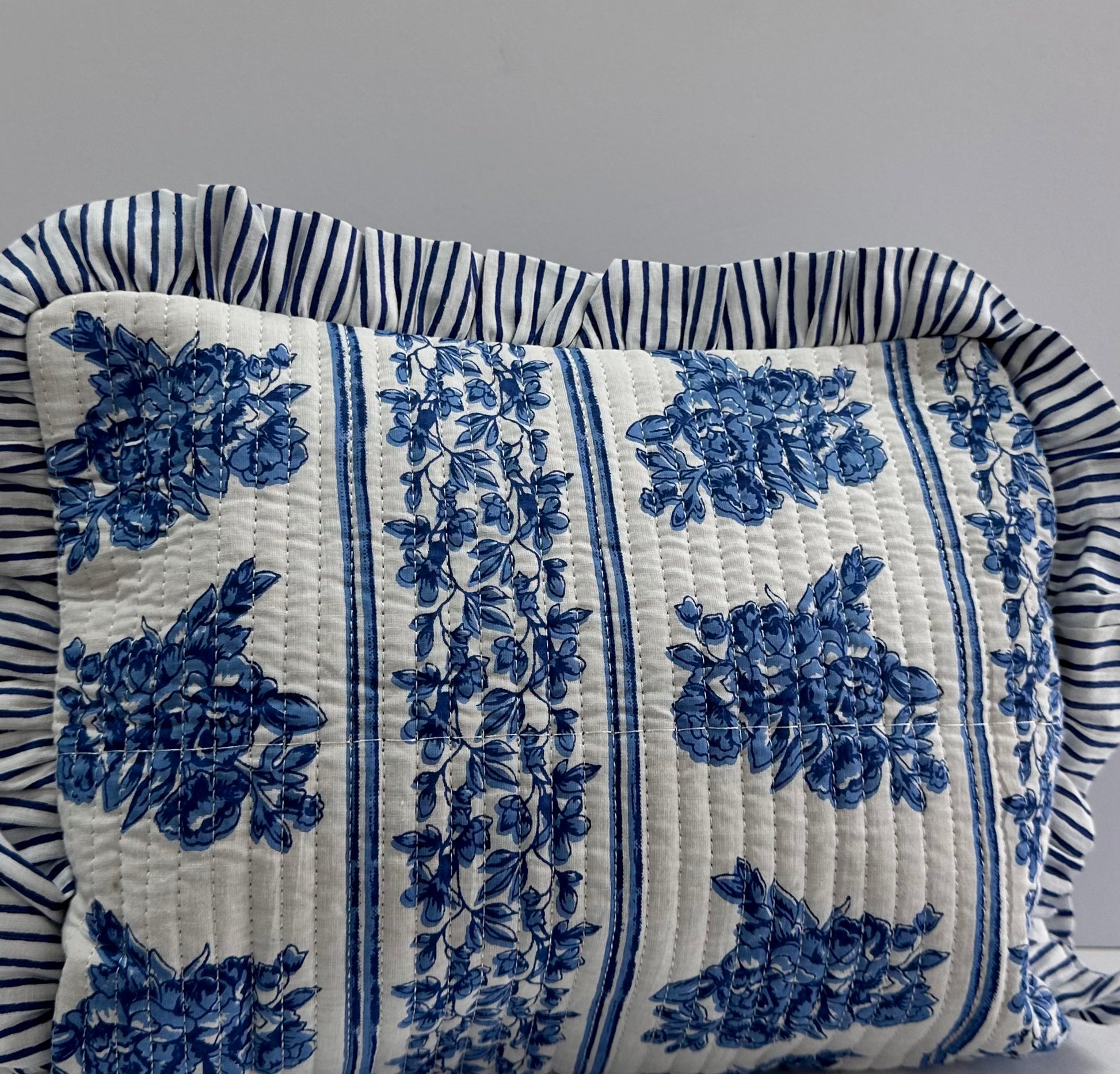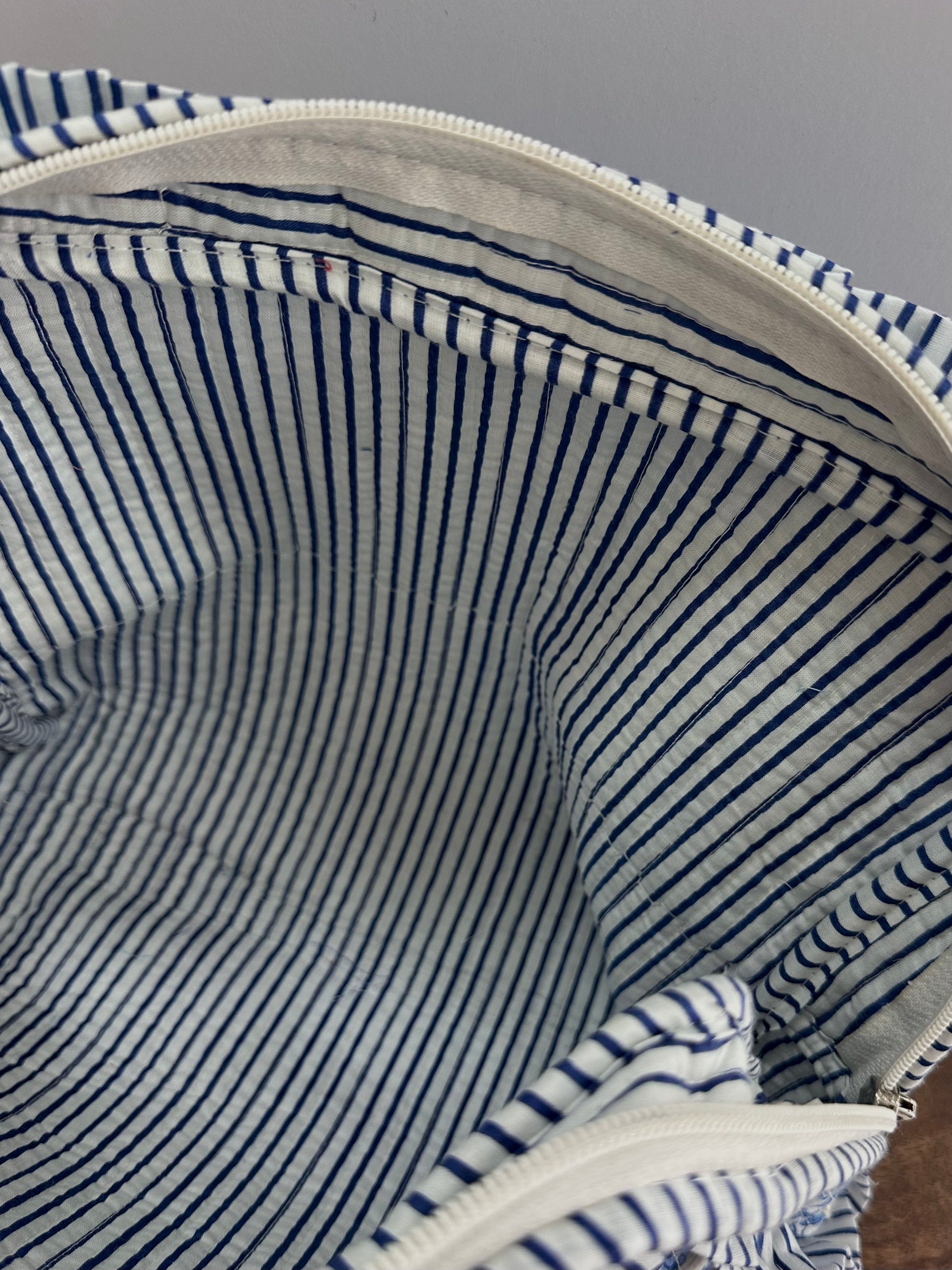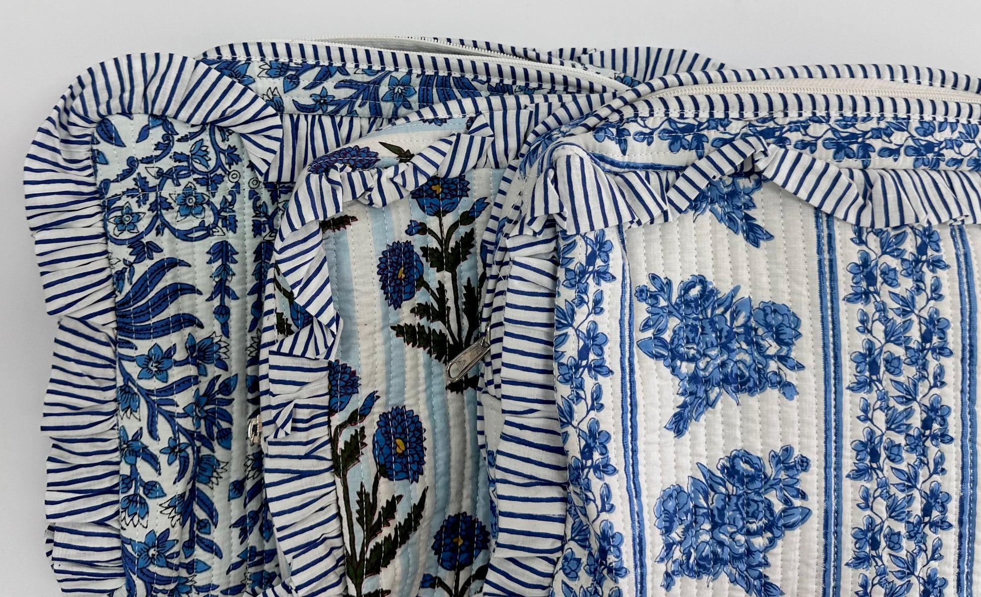 Our different pouches feature intricate floral designs set against a soft blue striped background. The ruffle detailing adds a touch of whimsy, while the classic blue tones exude elegance.