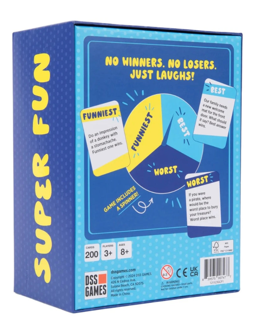 - HOW TO PLAY: It’s simple! The judge flicks the spinner to see which of the three fun categories to pull a card from that round: Best, Worst, or Funniest. Players do what’s on the card and the judge picks their favorite response. The player to the left becomes the next judge and the family fun continues.