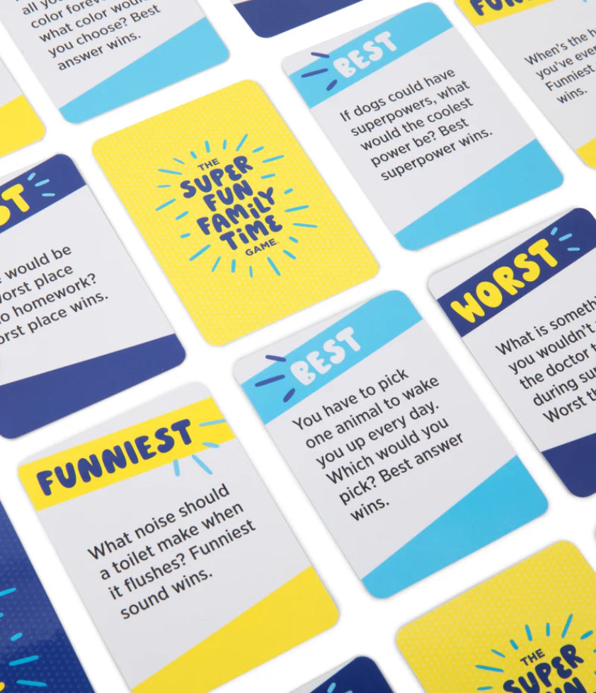 - The Super Fun Family Time Game is the perfect activity to bring the whole family together without screens. Create memories and start conversations with your kids and teens. There are no winners or losers, just laughs!