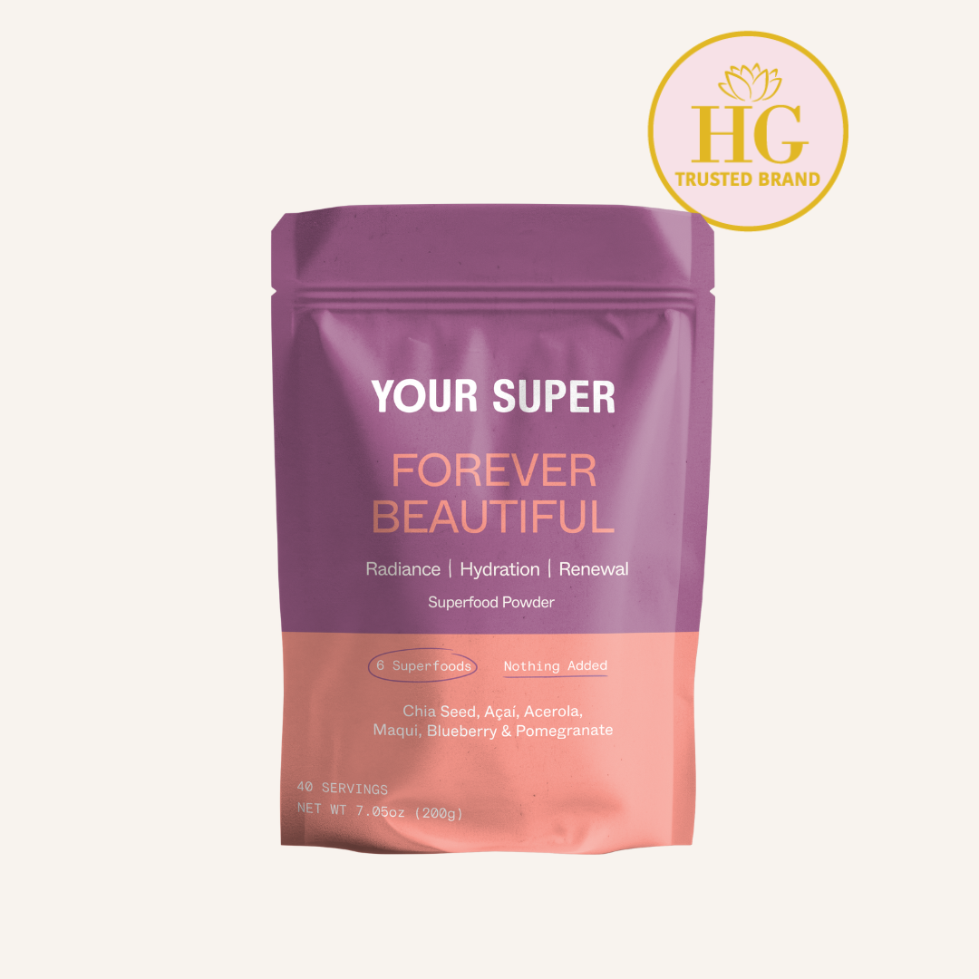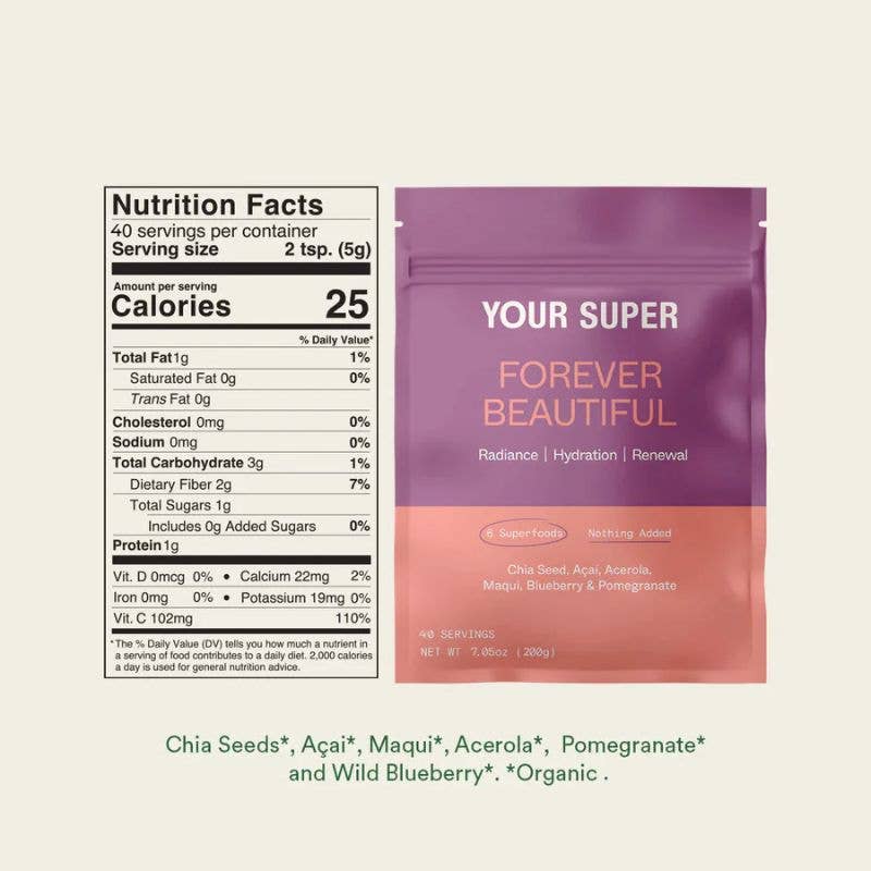 Forever Beautiful is a superfood blend with a rich composition of antioxidants designed to hydrate, nourish, and protect the skin, enhancing your natural glow effectively. The formulation includes Açaí, Maqui, and Acerola berries, which are proven to supply strong antioxidants that contribute to a healthy complexion. Chia seeds are incorporated for their essential fatty acids and fiber, which support skin hydration and overall health. The presence of wild blueberries and pomegranate provides valuable nutrients beneficial for the skin. Quantity: 40 servings.