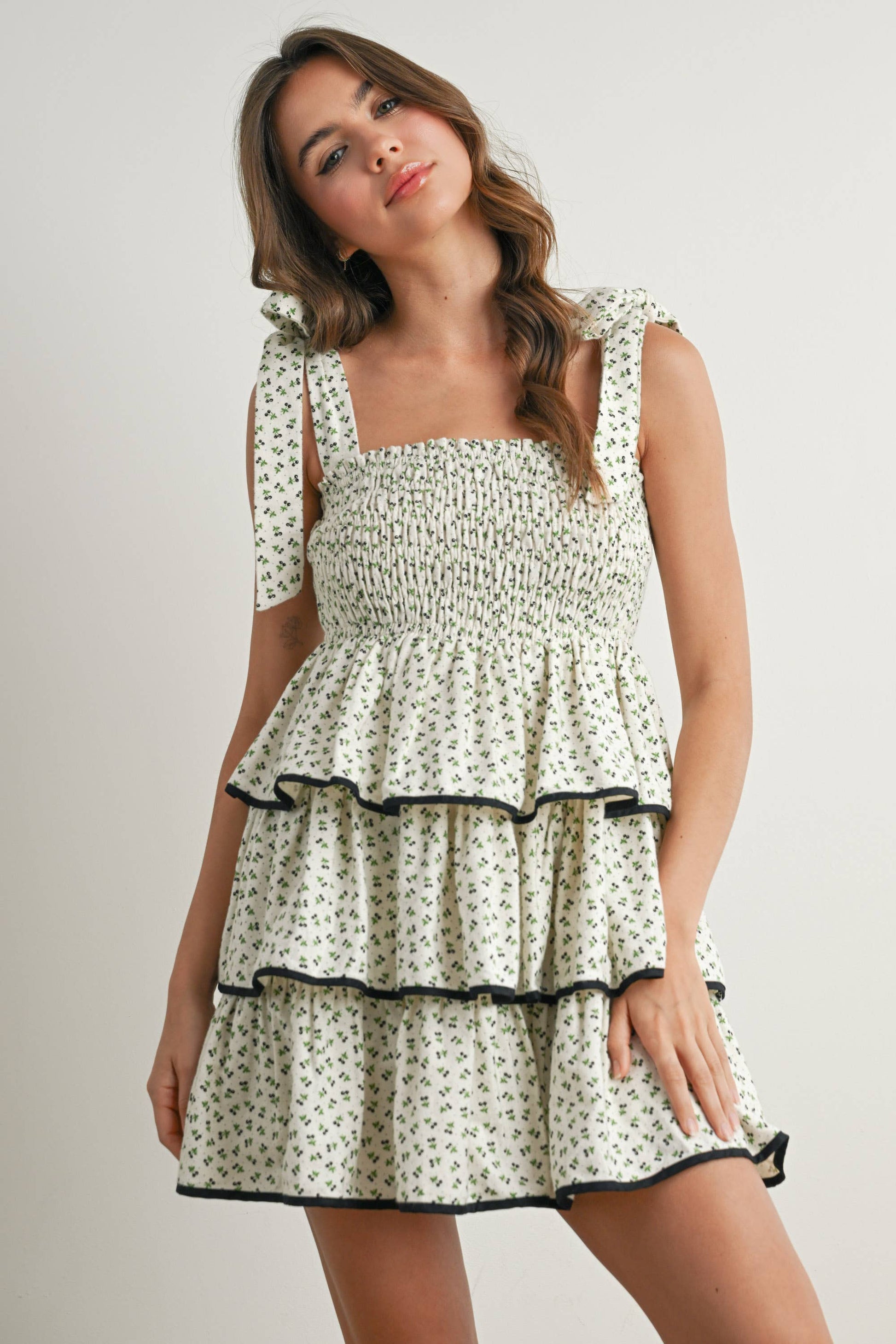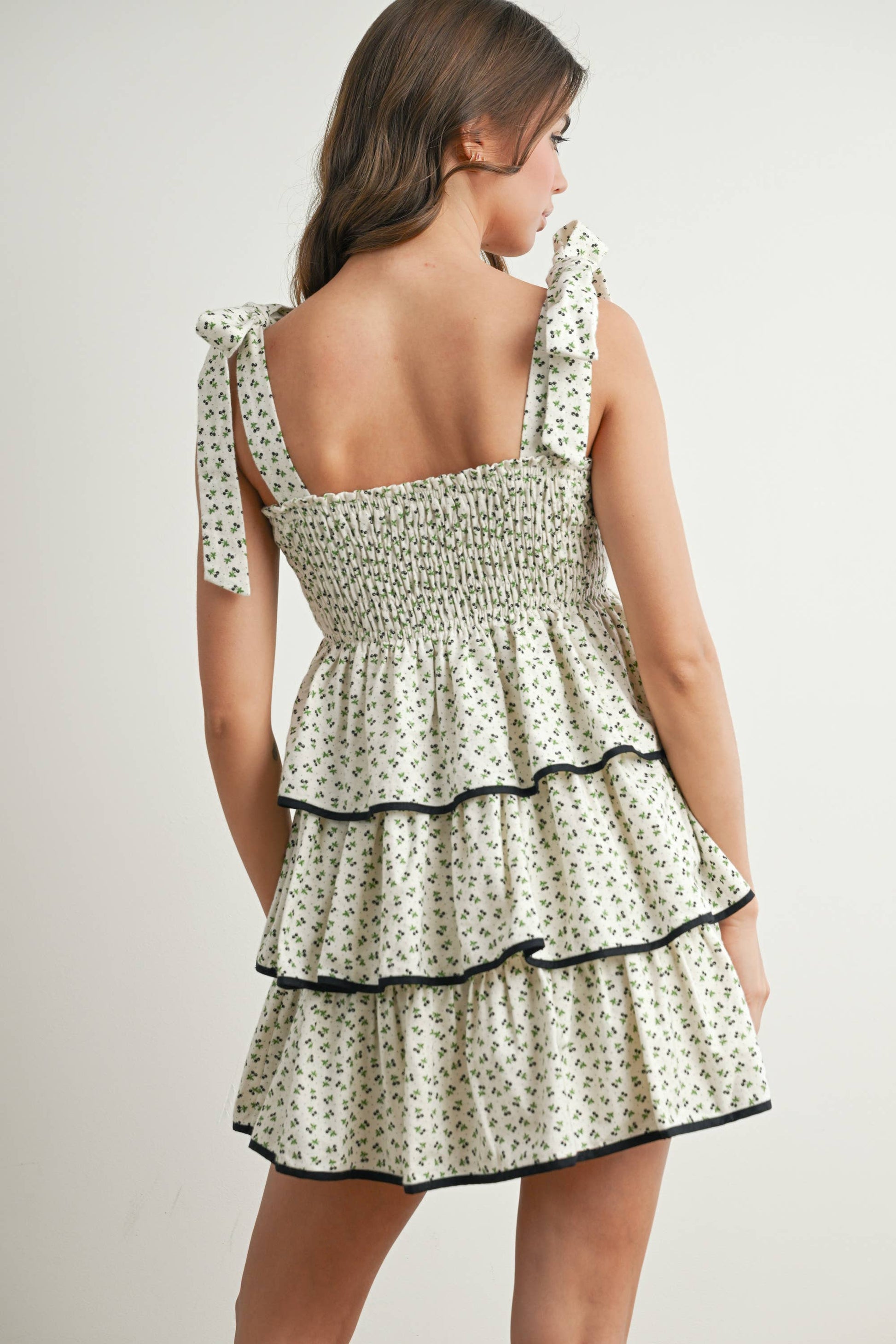 Designed with a smocked bodice for a flattering fit and adjustable tie straps for added detail, this dress offers both comfort and elegance.