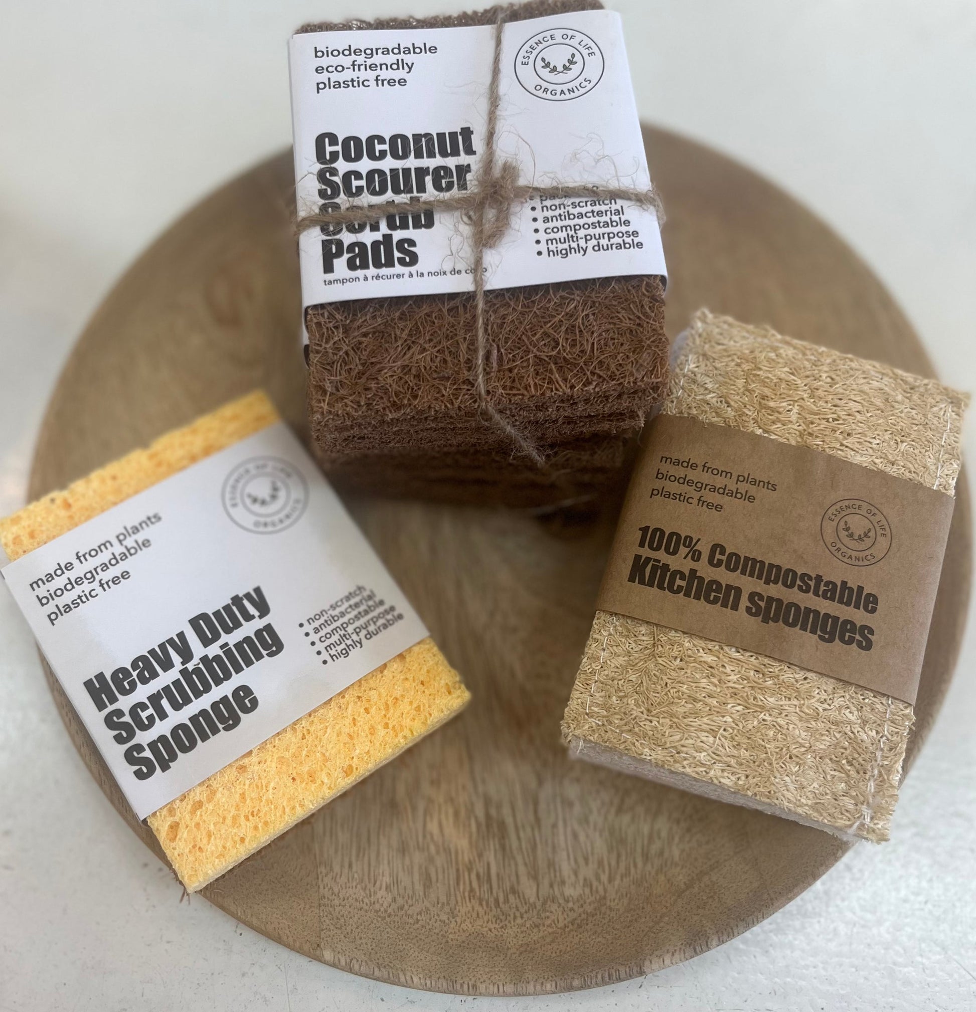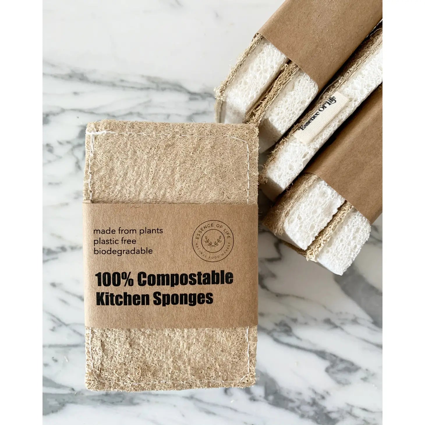 Compostable Kitchen Sponges, (2 pack), made from wood pulp and loofah plant fibres. Durable loofah top effectively removes tough stains without scratching surfaces.