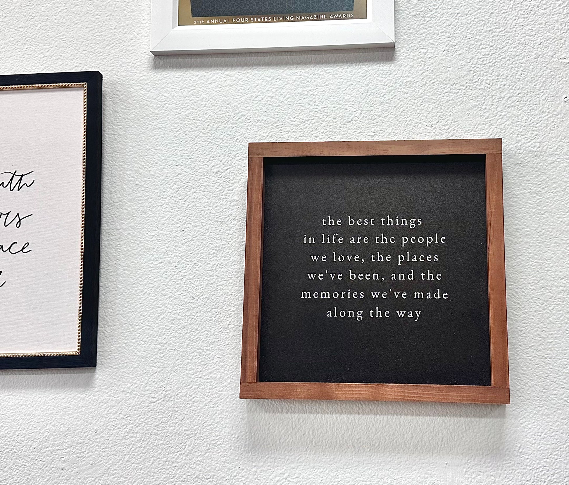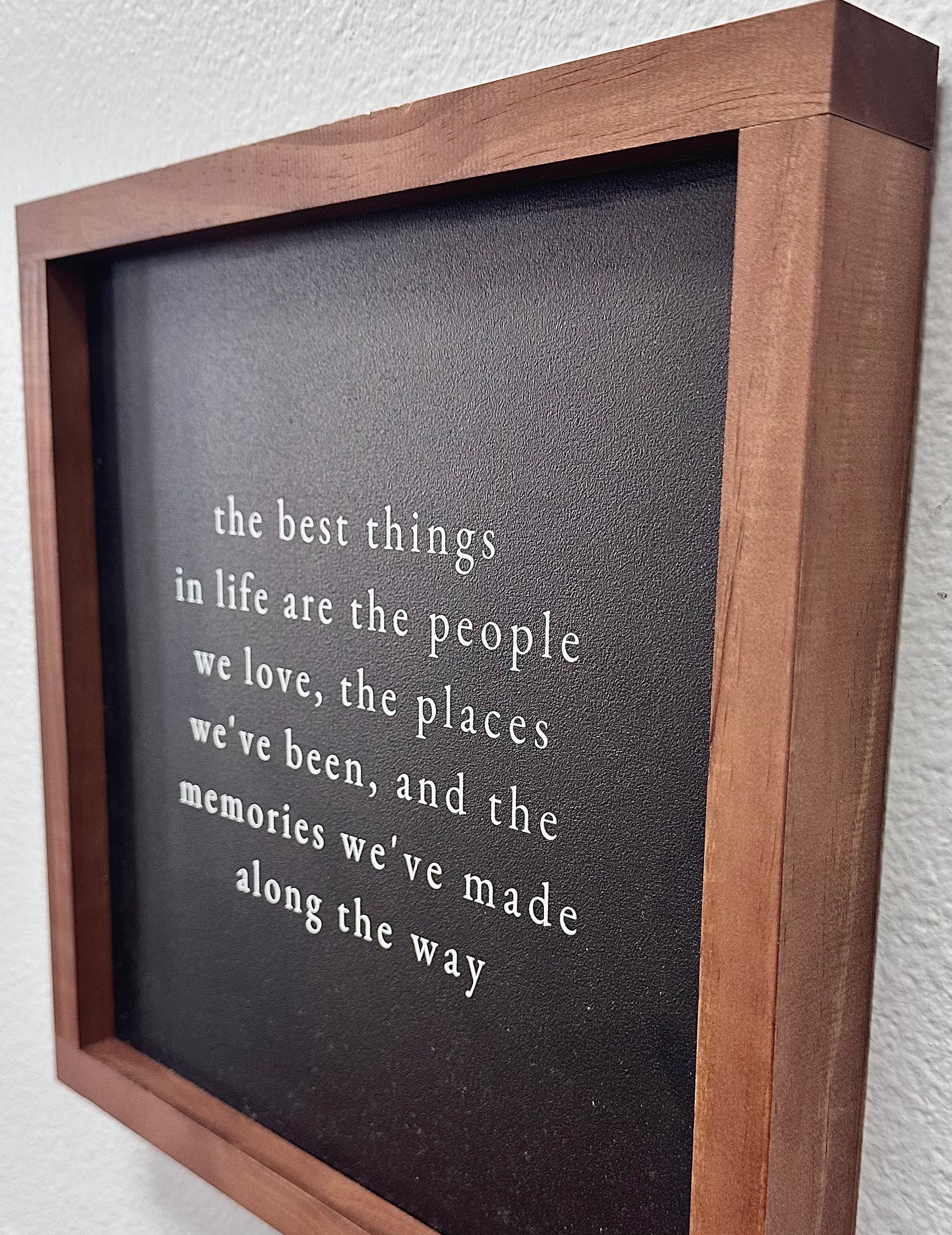 This handcrafted wood sign from Wisconsin adds a unique touch to any home. Each piece is one-of-a-kind, making it a special addition to your decor. Featuring the quote, "The best things in life are the people we love, the places we've been, and the memories we've made along the way."