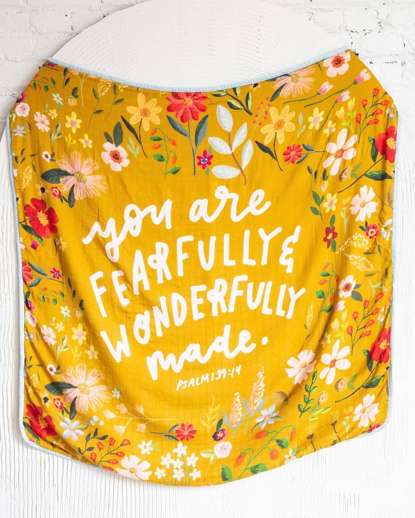 I created this “Wonderfully Made” design because every child should know of their intrinsic value and dignity and that they are created fearfully and wonderfully. The floral design is to reflect back to them their beauty.
